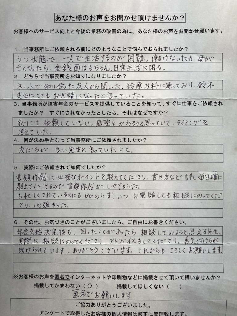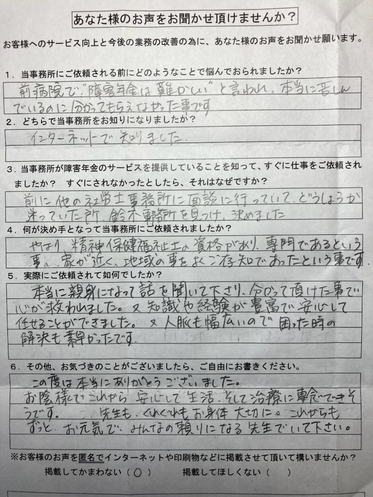 障害年金の事や手続き、分からない事ばかりでしたが鈴木先生と主治医の先生に色々教えて助けて頂いて、おかげで無事2級を受給する事が出来ました。